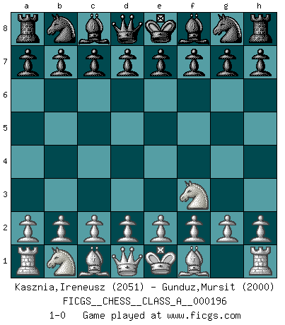 Last move : 1-0 2018 November 2 21:36:30 [Event "FICGS__CHESS__CLASS_A__000196"] [Site "FICGS"] [Date "2018.09.23"] [Round "1"] [White "Kasznia,Ireneusz"] [Black "Gunduz,Mursit"] [Result "1-0"] [WhiteElo "2051"] [BlackElo "2000"] 1.Nf3 1-0 This chess game has been lost on time (started : 2018.09.23 0:10:24) Reti Opening Player White won this chess game. Follow this game move after move (download)I play correspondence chess because it is both art and science while chess is art only. (A player at FICGS) Ich spiele 70 Eröffnungssysteme. (Viktor Kortschnoi) Ciertamente el estado mental actual de Bobby Fischer es una tragedia. Uno de los mas grandes jugadores de Ajedrez del mundo -el orgullo y pena del Ajedrez Americano. (Frank Brady) Botvinnik disait en comparant les échecs à la musique: Il existe une science dont le but est l'étude de l'acoustique et des sons. Mais il y a aussi un art qui se sert de l'océan des sons : c'est la musique. De toute évidence, il en est de même pour la pensée. La logique est l'étude des lois de la réflexion et les échecs reflètent, en tant qu'art, le côté logique de la réflexion, sous la forme d'images artistiques... Extrait de Fischer - Spassky, Reykjavik 1972 par Alexander & F. Wyndham (Ed. Solar), p 37. Perfection is achieved, not when there is nothing more to add, but when there is nothing left to take away. (Antoine de Saint-Exupéry)