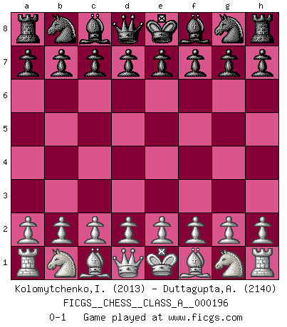 Last move : 0-1 2018 November 2 9:33:33 [Event "FICGS__CHESS__CLASS_A__000196"] [Site "FICGS"] [Date "2018.09.23"] [Round "1"] [White "Kolomytchenko,Igor"] [Black "Duttagupta,Aniruddha"] [Result "0-1"] [WhiteElo "2013"] [BlackElo "2140"] 0-1 This chess game has been lost on time (started : 2018.09.23 0:10:24) Player Black won this chess game. Follow this game move after move (download)Chess opens and enriches your mind. (Saudin Robovic) Das Schachspiel ist ein See, in welchem eine Mücke baden und ein Elefant ertrinken kann. (Emanuel Lasker) Observen a Garry Kasparov. Después de una derrota, invariablemente el gana la próxima partida. Prácticamente hace pedazos a su siguiente oponente. Eso es algo que tenemos que aprender a lograr. (Maurice Ashley) Il n'y a pas eu de défaite parce que je ne crois pas que cet ordinateur ait jamais existé. IBM a triché en refusant d'imprimer les modes de recherche de la machine. C'est évident, pendant le match, des coups décisifs ont été joués par des êtres humains. Aujourd'hui, les meilleurs spécialistes en informatique ne peuvent toujours pas expliquer comment Deep-Blue a pu jouer contre la logique des ordinateurs. IBM a gagné une guerre de communication, mais ils sont incapables de prouver que l'ordinateur a gagné tout seul. (Garry Kasparov) How many people work in NATO Headquarters ? - About half of them. (Dirk Stikker, NATO general secretary)