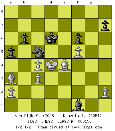 Last move : 1/2-1/2 2019 June 5 13:1:30 [Event "FICGS__CHESS__CLASS_A__000196"] [Site "FICGS"] [Date "2018.09.23"] [Round "1"] [White "van Dijk,Erik L."] [Black "Kasznia,Ireneusz"] [Result "1/2-1/2"] [WhiteElo "2045"] [BlackElo "2051"] 1.d4 Nf6 2.c4 g6 3.Nc3 Bg7 4.e4 d6 5.f3 O-O 6.Be3 c5 7.dxc5 dxc5 8.Qxd8 Rxd8 9.Bxc5 Nc6 10.Nge2 b6 11.Ba3 Ba6 12.Nb5 Rd7 13.Rd1 Rad8 14.Rxd7 Nxd7 15.Nf4 e6 16.Be2 Bb7 17.O-O a6 18.Nc3 Bd4+ 19.Kh1 Nde5 20.Rd1 Kg7 21.Bf1 Be3 22.Rxd8 Nxd8 23.Nh3 Bd4 24.Ng1 Bxc3 25.bxc3 Bc8 26.Bd6 Nd7 27.Bc7 Nb7 28.Ne2 Nbc5 29.Kg1 f6 30.Kf2 e5 31.Nc1 Ne6 32.Bd6 Ndc5 33.Nd3 Nxd3+ 34.Bxd3 Kf7 35.g3 Ke8 36.f4 exf4 37.gxf4 Kd7 38.Bb8 Nc5 39.Bc2 Kc6 40.f5 gxf5 41.exf5 a5 42.Ke3 Ba6 43.Kd4 Kd7 44.Bf4 Bb7 45.Ke3 Bg2 46.Bh6 Bf1 47.Kd4 Ke7 48.Bf4 Kd7 49.Bb8 Bh3 50.Bg3 Bf1 51.Bh4 Ke7 52.Be1 Kd6 53.Bd2 Bh3 54.Bc1 Ke7 55.Ba3 Kd6 56.Be4 Bf1 1/2-1/2 King's Indian : Saemisch, 5...O-O Kingside Castling by player Black (move 5) Kingside Castling by player White (move 17) This chess game ended in a draw. Follow this game move after move (download)Chess is a cold bath for the mind. (Sir John Simon) Wie kann ich Remis annehmen? Ich weiß ja gar nicht, wie ich stehe! (Fritz Sämisch) Debemos de asegurarnos de que el Ajedrez no se convierta en un lenguaje muerto, muy interesante, pero solo para un grupo muy pequeño. (Sytze Faber) Ce qui est bien, c'est d'avoir tout un tas de pièces en prise : l'adversaire ne peut en prendre qu'une à la fois. Cité par Thierry Audin. If you have any trouble condescending, find a Unix user to show you how it's done. (Scott Adams)