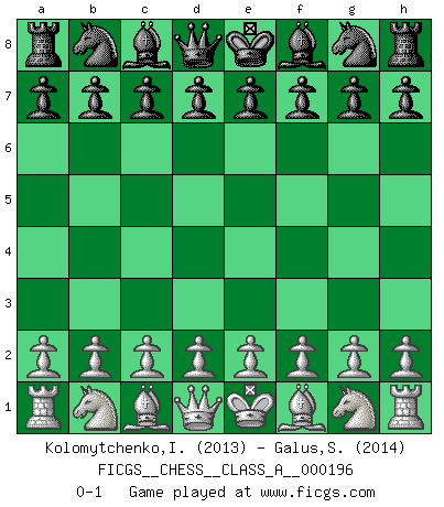 Last move : 0-1 2018 November 2 9:33:33 [Event "FICGS__CHESS__CLASS_A__000196"] [Site "FICGS"] [Date "2018.09.23"] [Round "1"] [White "Kolomytchenko,Igor"] [Black "Galus,Stanislaw"] [Result "0-1"] [WhiteElo "2013"] [BlackElo "2014"] 0-1 This chess game has been lost on time (started : 2018.09.23 0:10:24) Player Black won this chess game. Follow this game move after move (download)Castle early and often. (Rob Sillars) Früher wurde jeder komplizierte Zug, jedes interessante Opfer mit großem Beifall und Enthusiasmus aufgenommen. Heute schaltet man einfach seinen Fritz an, und man kann sehen, was los ist, ob der Zug geht oder nicht. (Vladimir Kramnik) Jugadores de primera clase pierden en contra de jugadores de segunda clase porque los jugadores de segunda clase a veces juegan una partida de primer clase. (Siegbert Tarrasch) Les Echecs sont et restent toujours un combat, un combat intégral comme la boxe, la lutte ou un autre sport, et où il doit y avoir un vainqueur et un vaincu. (Joseph Emil Diemer) 98% of all statistics are made up. (Author unknown)