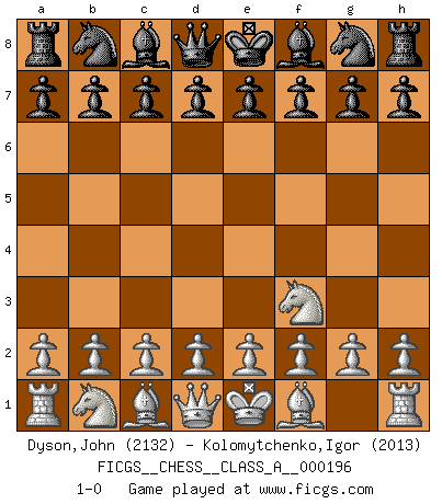 Last move : 1-0 2018 November 2 9:33:33 [Event "FICGS__CHESS__CLASS_A__000196"] [Site "FICGS"] [Date "2018.09.23"] [Round "1"] [White "Dyson,John"] [Black "Kolomytchenko,Igor"] [Result "1-0"] [WhiteElo "2132"] [BlackElo "2013"] 1.Nf3 1-0 This chess game has been lost on time (started : 2018.09.23 0:10:24) Reti Opening Player White won this chess game. Follow this game move after move (download)Fischer is completely natural. He plays no roles. He's like a child. Very, very simple. (Zita Rajcsanyi) Wenn ich Weiß habe gewinne ich weil ich Weiß habe, wenn ich Schwarz habe gewinne ich weil ich Bogoljubov bin. (Efim Bogoljubov) La última cosa en que Fischer estaba interesado era en tonterías, siempre y cuando el Ajedrez estuviera involucrado. (Elie Agur) Les échecs, c'est l'art d'analyser. (Mikhail Botvinnik) It is not enough to be a good player... you must also play well. (Siegbert Tarrasch)