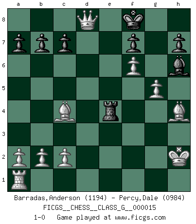 Last move : 1-0 2007 July 7 5:29:7 [Event "FICGS__CHESS__CLASS_G__000015"] [Site "FICGS"] [Date "2007.05.19"] [Round "1"] [White "Barradas,Anderson"] [Black "Percy,Dale"] [Result "1-0"] [WhiteElo "1194"] [BlackElo "0984"] 1.e4 e5 2.Nf3 d6 3.d4 Nf6 4.Bg5 Bg4 5.dxe5 Nc6 6.exf6 gxf6 7.Bh4 Bh6 8.h3 Bh5 9.Nc3 O-O 10.Nd5 Qe8 11.Nxf6+ Kg7 12.Nxe8+ Rfxe8 13.Bd3 Re6 14.O-O Nb4 15.g4 Bg6 16.Nd4 Re5 17.Nf5+ Bxf5 18.exf5 Nd5 19.f6+ Kf8 20.Re1 Nf4 21.Rxe5 Nxh3+ 22.Kh2 dxe5 23.Kxh3 Re8 24.g5 e4 25.Bc4 e3 26.fxe3 Rxe3+ 27.Kh2 Re4 28.Qd8+ 1-0 Philidor : Nimzovich (Jaenisch) variation Kingside Castling by player Black (move 9) Kingside Castling by player White (move 14) Player White won this chess game. Follow this game move after move (download)There is no remorse like the remorse of Chess. (H. G. Wells) Du kannst im Schach nur gut werden, wenn du das Spiel liebst. (Robert James Fischer) El jugador blanco perdió porque fallo en recordar la coreccta continuación y tuvo que pensar por sí mismo las movidas. (Siegbert Tarrasch) Les échecs sont un jeu par leur forme, un art par leur essence et une science par sa difficulté d'acquisition. Ils peuvent vous procurer autant de plaisir qu'un bon livre ou une belle musique, mais vous n'aurez une réelle joie que si vous arrivez à bien jouer. (Tigran Petrosian) Wisdom is the reward you get for a lifetime of listening when you'd have preferred to talk. (Doug Larson)