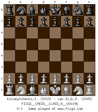 Last move : 0-1 2018 November 2 9:33:33 [Event "FICGS__CHESS__CLASS_A__000196"] [Site "FICGS"] [Date "2018.09.23"] [Round "1"] [White "Kolomytchenko,Igor"] [Black "van Dijk,Erik L."] [Result "0-1"] [WhiteElo "2013"] [BlackElo "2045"] 0-1 This chess game has been lost on time (started : 2018.09.23 0:10:24) Player Black won this chess game. Follow this game move after move (download)Chess is as much a mystery as women. (Purdy) Drei Punkte vor allen anderen ist wie einer, der im weißen Anzug posiert, während der Rest in Müllsäcke gekleidet dasteht. (Viktor Kortschnoi) En un gambito tu regalas un Peón por el bién de tomar un juego perdido. (Samuel Standige Boden) Pour moi, les échecs ne sont pas un jeu mais un art. (Alexandre Alekhine) The man who strikes first admits that his ideas have given out. (Chinese proverb)