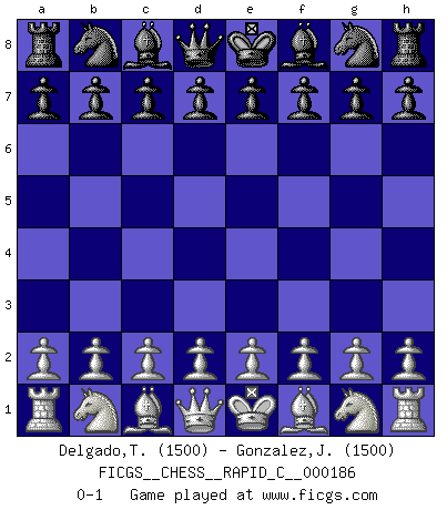 Last move : 0-1 2018 October 23 9:48:29 [Event "FICGS__CHESS__RAPID_C__000186"] [Site "FICGS"] [Date "2018.09.23"] [Round "1"] [White "Delgado,Thiago"] [Black "Gonzalez,Julio Cesar"] [Result "0-1"] [WhiteElo "1500"] [BlackElo "1500"] 0-1 This chess game has been lost on time (started : 2018.09.23 3:55:24) Player Black won this chess game. Follow this game move after move (download)Dazzling combinations are for the many, shifting wood is for the few. (Georg Kieninger) Ich tröste mich mit dem Vergnügen, daß Schachfans, Zuschauer und Leser glücklich sind, wenn ein Großmeister etwas riskiert, statt nur Klötzchen zu schieben. (Mikhail Nekhemyevich Tal) El Ajedrez es un juego de pelea el cual es puramente intelectual e incluye la suerte. (Richard Reti) Le plus grand jeu de l'esprit jamais inventé, plus vous l'apprenez, plus vous y prenez du plaisir. (Garry Kasparov) Shallow men believe in luck. Strong men belive in cause and effect. (Ralph Waldo Emerson)