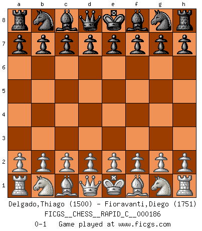 Last move : 0-1 2018 October 23 9:48:29 [Event "FICGS__CHESS__RAPID_C__000186"] [Site "FICGS"] [Date "2018.09.23"] [Round "1"] [White "Delgado,Thiago"] [Black "Fioravanti,Diego"] [Result "0-1"] [WhiteElo "1500"] [BlackElo "1751"] 0-1 This chess game has been lost on time (started : 2018.09.23 3:55:24) Player Black won this chess game. Follow this game move after move (download)I'd rather have a Pawn than a finger. (Reuben Fine) Meine Liebe ist Schach, Schach, Schach. Ich muss jeden Tag Schach spielen, deshalb fühle ich mich so stark. (Miguel Najdorf) Haz el enroque temprano y seguido. (Rob Sillars) Les échecs sont utiles à l'exercice de la faculté de penser et à celle de l'imagination. Car nous devons posséder une méthode élaborée pour atteindre des buts partout où nous devons conduire notre raison. (Leibnitz) Lottery : A tax on people who are bad at math. (Author unknown)