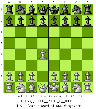 Last move : 1-0 2018 October 30 9:11:58 [Event "FICGS__CHESS__RAPID_C__000186"] [Site "FICGS"] [Date "2018.09.23"] [Round "1"] [White "Pech,Jaroslav"] [Black "Gonzalez,Julio Cesar"] [Result "1-0"] [WhiteElo "1599"] [BlackElo "1500"] 1.d4 1-0 This chess game has been lost on time (started : 2018.09.23 3:55:24) Queen's pawn Player White won this chess game. Follow this game move after move (download)When I have White, I win because I am white; When I have Black, I win because I am Bogolyubov. (Bogolyubov) Schach ist Kampf, hauptsächlich jedoch gegen die eigenen Fehler. (Savielly Grigorievitsch Tartakower) Con el fin de mejorar tu juego, debes de estudiar los finales antes que todo, ya que mientras que los finales pueden ser estudiados y dominados por sí mismos, el juegomedio y la apertura deben de ser estudiados en relación con los finales. (José Raúl Capablanca) Vouloir jouer aux échecs contre soi-même est aussi paradoxal que vouloir marcher sur son ombre. (Stefan Zweig) Follow your passion, and success will follow you. (Arthur Buddhold)