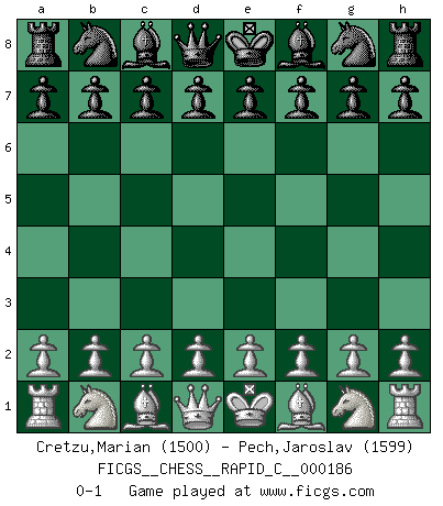 Last move : 0-1 2018 October 23 9:48:29 [Event "FICGS__CHESS__RAPID_C__000186"] [Site "FICGS"] [Date "2018.09.23"] [Round "1"] [White "Cretzu,Marian"] [Black "Pech,Jaroslav"] [Result "0-1"] [WhiteElo "1500"] [BlackElo "1599"] 0-1 This chess game has been lost on time (started : 2018.09.23 3:55:24) Player Black won this chess game. Follow this game move after move (download)I still hope to kill Fischer. (Boris Spassky) Glücklicherweise sind Großmeister Ruben Fines reine Schachbücher weniger phallozentrisch [als seine Schachpsychologie] und deswegen auch weniger lächerlich. (Nigel Short) Buenas posiciones no logran ganar juegos, buenas movidas sí. (Gerald Abrahams) Un millionnaire : 'Monsieur Steinitz ! Vous ne participez aux tournois que pour l'argent, alors que moi je n'y viens que pour l'honneur.' Steinitz : 'Chacun joue pour ce qu'il n'a pas'... Now be brave and don't look back. Don't look back. (Shmi Skywalker in Star Wars ep.1)