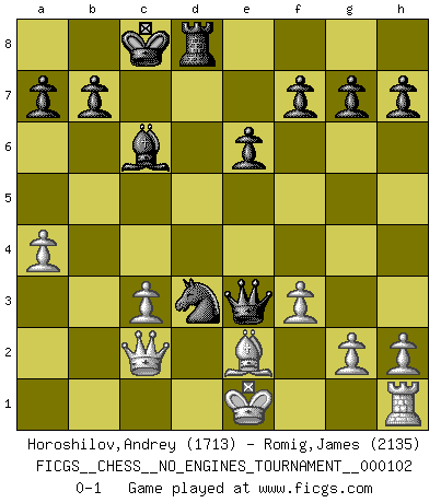 Last move : 0-1 2018 October 13 13:3:51 [Event "FICGS__CHESS__NO_ENGINES_TOURNAMENT__000102"] [Site "FICGS"] [Date "2018.09.23"] [Round "1"] [White "Horoshilov,Andrey"] [Black "Romig,James"] [Result "0-1"] [WhiteElo "1713"] [BlackElo "2135"] 1.d4 Nf6 2.c4 e6 3.Nc3 Bb4 4.a3 Bxc3+ 5.bxc3 c5 6.Bg5 d6 7.dxc5 Qa5 8.cxd6 Qxg5 9.Nf3 Qa5 10.Qc2 Bd7 11.a4 Na6 12.Nd2 Nc5 13.Nb3 Nxb3 14.Qxb3 Bc6 15.f3 Qe5 16.c5 Nd7 17.Qc2 Nxc5 18.e3 O-O-O 19.Bb5 Qxe3+ 20.Be2 Rxd6 21.Rd1 Rxd1+ 22.Qxd1 Rd8 23.Qc2 Nd3+ 0-1 Nimzo-Indian : Saemisch variation Queenside Castling by player Black (move 18) Player Black won this chess game. Follow this game move after move (download)I like the moment when I break a man's ego. (Bobby Fischer) Ich habe Putins Aufstieg an die Macht beobachtet und seine Politik, die demokratischen Institutionen meines Landes zu zerstören. (Garry Kasparov) El Ajedrez expande y enriquece tu mente. (Saudin Robovic) La vie est comme un jeu d'échecs : nous esquissons un plan, mais celui-ci est tributaire de ce que daignent faire l'adversaire aux échecs et le destin dans la vie. (Arthur Schopenhauer) You have to believe in yourself. (Sun Tzu)