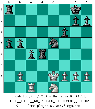 Last move : 0-1 2018 October 25 0:9:55 [Event "FICGS__CHESS__NO_ENGINES_TOURNAMENT__000102"] [Site "FICGS"] [Date "2018.09.23"] [Round "1"] [White "Horoshilov,Andrey"] [Black "Barradas,Anderson"] [Result "0-1"] [WhiteElo "1713"] [BlackElo "1231"] 1.d4 Nf6 2.c4 d5 3.e3 e6 4.Nf3 Nc6 5.cxd5 Qxd5 6.Nc3 Qa5 7.Bd3 Nd5 8.Bd2 Ncb4 9.Bc4 Qb6 10.Nxd5 exd5 11.Be2 Bf5 12.Qa4+ Nc6 13.Bc3 Bd7 14.Qd1 Bb4 15.Rb1 Bf5 16.Nh4 Bxb1 17.Bxb4 Qxb4+ 18.Qd2 Qxd2+ 19.Kxd2 Bxa2 20.Ra1 Bc4 21.Bxc4 dxc4 22.Ra4 b5 23.Ra1 a5 24.Rc1 O-O 25.Nf3 f6 26.Ne1 Rfd8 27.Nc2 Ne5 28.Ne1 c5 29.Ke2 cxd4 30.exd4 Rxd4 0-1 Queen's pawn game Kingside Castling by player Black (move 24) Player Black won this chess game. Follow this game move after move (download)I have added these principles to the law: get the Knights into action before both Bishops are developed. (Emanuel Lasker) Wenn ich Weiß habe gewinne ich weil ich Weiß habe, wenn ich Schwarz habe gewinne ich weil ich Bogoljubov bin. (Efim Bogoljubov) Si el ingenio solamente fuese necesario para lucirse, las mujeres serían las mejores jugadoras de Ajedrez del mundo. (Albin) Echiquier : carré parfait, comme la Jérusalem nouvelle décrite par l'auteur de l'Apocalypse, huit cases sur huit, exaltation du chiffre 4, symbole du cosmos aux quatre horizons... où le noir et le blanc, l'ombre et la lumière, le mal et le bien s'entremêlent et se conjuguent. (Robert Couffignal, Le Gambit du poète) A good teacher is like a candle - it consumes itself to light the way for others. (Author unknown)