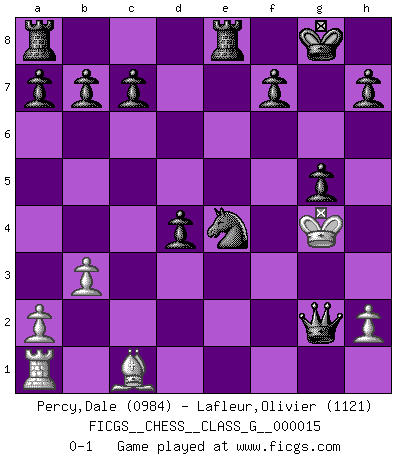 Last move : 0-1 2007 July 21 4:37:1 [Event "FICGS__CHESS__CLASS_G__000015"] [Site "FICGS"] [Date "2007.05.19"] [Round "1"] [White "Percy,Dale"] [Black "Lafleur,Olivier"] [Result "0-1"] [WhiteElo "0984"] [BlackElo "1121"] 1.e4 e5 2.Nf3 Nc6 3.Nc3 Nf6 4.Nb5 d5 5.d3 Bc5 6.d4 Bxd4 7.Qe2 Bg4 8.Nbxd4 Nxd4 9.Qd3 Bxf3 10.gxf3 O-O 11.c3 Ne6 12.Bh3 Nc5 13.Qe3 d4 14.cxd4 exd4 15.Qf4 Re8 16.O-O Ncxe4 17.fxe4 Nxe4 18.Qh4 Qxh4 19.f3 Qxh3 20.Re1 Qxf3 21.b3 Qf2+ 22.Kh1 Qxe1+ 23.Kg2 Qf2+ 24.Kh3 g5 25.Kg4 Qg2+ 0-1 Four knights game Kingside Castling by player Black (move 10) Kingside Castling by player White (move 16) Player Black won this chess game. Follow this game move after move (download)He who takes the Queen's Knight's Pawn will sleep in the streets. (Anonymous) Schach ist ein Kampf gegen den Fehler. (Johannes Herrman Zukertort) Un juego de Ajedrez es un dialogo, una conversación entre un jugador y su oponente. Cada movimiento del oponente puede contener amenazas o tropiezos, pero un jugador no se puede defender de las amenazas o tomar ventaja de los tropiezos si es que no se pregunta a sí mismo: ¿Que es lo que mi oponente va a hacer después de cada movida?. (Bruce A. Moon) Il n'y a plus de joueurs du niveau de Jacob Murray dont la seule quête est le beau jeu, le plaisir de voir les pièces construire quelque chose. Sur 10 idées à la minute, 9 seront sans intérêt, la dernière s'avèrera géniale. (Christian Bauer) No enterprise is more likely to succeed than one concealed from the enemy until it is ripe for execution. (Niccolo Machiavelli)