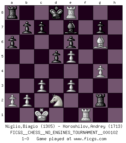 Last move : 1-0 2018 November 11 6:9:52 [Event "FICGS__CHESS__NO_ENGINES_TOURNAMENT__000102"] [Site "FICGS"] [Date "2018.09.23"] [Round "1"] [White "Niglio,Biagio"] [Black "Horoshilov,Andrey"] [Result "1-0"] [WhiteElo "1305"] [BlackElo "1713"] 1.d4 Nf6 2.Nf3 d5 3.Bf4 e6 4.e3 Nc6 5.Nbd2 Be7 6.c3 O-O 7.Bd3 Nh5 8.Bg3 f5 9.Ne5 Nxe5 10.dxe5 Qe8 11.Be2 Nxg3 12.hxg3 Bd7 13.g4 Qg6 14.Qc2 a6 15.O-O-O f4 16.Qxg6 hxg6 17.Bd3 fxe3 18.fxe3 Rf2 19.Bxg6 Rxg2 20.Bh7+ Kf7 21.Rdf1+ Ke8 22.Bg6+ Kd8 23.Rh8+ Be8 24.Rxe8+ 1-0 Queen's pawn game Kingside Castling by player Black (move 6) Queenside Castling by player White (move 15) Player White won this chess game. Follow this game move after move (download)Avoid the crowd. Do your own thinking independently. Be the Chess player, not the Chess piece. (Ralph Charell) Der 70jährige Viktor Kortschnoi: Die Rentenanstalt wollte mich zwingen in Rente zu gehen. Meine Frau erhält jetzt eine Pension- und ich zahle weiter in die Rentenkasse ein! (Viktor Kortschnoi) No volvere nunca a jugar contigo. Has insultado a mi amigo. - cuando un oponente se maldijo por una mala jugada (Miguel Najdorf) Demandez au pauvre Cg1 ce qu'il en pense. Eduard Gufeld à propos de la variante Saemisch de l'Est-Indienne. Your best chance to get a Royal Flush in a casino is in the bathroom. (Anonymous)