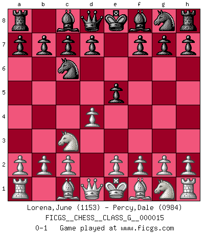 Last move : 0-1 2007 June 30 15:23:12 [Event "FICGS__CHESS__CLASS_G__000015"] [Site "FICGS"] [Date "2007.05.19"] [Round "1"] [White "Lorena,June"] [Black "Percy,Dale"] [Result "0-1"] [WhiteElo "1153"] [BlackElo "0984"] 1.d4 Nc6 2.Nc3 e5 0-1 This chess game has been lost on time (started : 2007.05.19 4:57:19) Queen's pawn : Lundin (Kevitz-Mikenas) defense Player Black won this chess game. Follow this game move after move (download)I still hope to kill Fischer. (Boris Spassky) Es liegt in der Natur, vernüftig zu denken und unlogisch zu handeln. (Anatole France) Un buen sacrificio es aquel que aunque no sea necesariamente sólido, deja a tu oponente aturdido y confuso. (Rudolph Spielmann) La victoire dans une partie d'Echecs appartient la plupart du temps à celui qui voit un peu plus loin que l'adversaire. (Lasker) If you work for a living, why do you kill yourself working ? (Tuco to a chicken in The Good, The Bad and The Ugly)