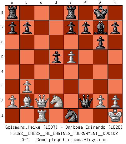 Last move : 0-1 2018 October 24 8:31:50 [Event "FICGS__CHESS__NO_ENGINES_TOURNAMENT__000102"] [Site "FICGS"] [Date "2018.09.23"] [Round "1"] [White "Goldmund,Heike"] [Black "Barbosa,Edinardo"] [Result "0-1"] [WhiteElo "1307"] [BlackElo "1828"] 1.e4 c5 2.c3 g6 3.d4 cxd4 4.cxd4 d6 5.Nf3 Bg7 6.Bc4 Qc7 7.b3 Nf6 8.Bb2 Nxe4 9.O-O O-O 10.Re1 Nf6 11.Nbd2 Re8 12.Ng5 d5 13.Bd3 Nc6 14.Ngf3 Nb4 15.Bb5 Bd7 16.Bxd7 Nxd7 17.Rc1 Qb6 18.Ne5 Nxe5 19.dxe5 Nd3 20.Qc2 Qxf2+ 21.Kh1 Nxe1 0-1 Sicilian : Alapin's variation (2.c3) Kingside Castling by player White (move 9) Kingside Castling by player Black (move 9) Player Black won this chess game. Follow this game move after move (download)All I want to do, ever, is just play Chess. (Bobby Fischer) Je mehr ich von der FIDE weiss, um so weniger verstehe ich. (Alexander Kalifman) Alguna parte de un error es siempre correcto. (Savielly Tartakover) À la honte des hommes, on sait que les lois du jeu sont les seules qui soient partout justes, claires, inviolables et exécutées. Pourquoi l'Indien qui a donné les règles du jeu d'échecs est-il obéi de bon gré dans toute la terre, et que les décrétales des papes, par exemple, sont aujourd'hui un objet d'horreur et de mépris ? C'est que l'inventeur des échecs combina tout avec justesse pour la satisfaction des joueurs, et que les papes, dans leurs décrétales, n'eurent en vue que leur seul avantage. L'Indien voulut exercer également l'esprit des hommes et leur donner du plaisir; les papes ont voulu abrutir l'esprit des hommes. Voltaire (Dictionnaire philosophique / Garnier 1967) If things go wrong, don't go with them. (Roger Babson)