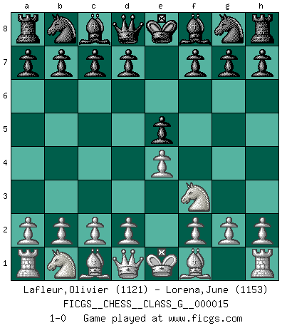 Last move : 1-0 2007 July 1 9:25:48 [Event "FICGS__CHESS__CLASS_G__000015"] [Site "FICGS"] [Date "2007.05.19"] [Round "1"] [White "Lafleur,Olivier"] [Black "Lorena,June"] [Result "1-0"] [WhiteElo "1121"] [BlackElo "1153"] 1.e4 e5 2.Nf3 1-0 This chess game has been lost on time (started : 2007.05.19 4:57:19) King's knight Opening Player White won this chess game. Follow this game move after move (download)No price is too great for the scalp of the enemy King. (Koblentz) Der Partner hat auch seine Existenzberechtigung. (Savielly Grigorievitsch Tartakower) El Ajedrez es un juego de pelea el cual es puramente intelectual e incluye la suerte. (Richard Reti) Je menace de comprendre la position. (Anonyme) Life is the sum of all your choices. (Albert Camus)