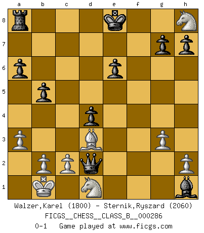 Last move : 0-1 2018 October 26 18:16:52 [Event "FICGS__CHESS__CLASS_B__000286"] [Site "FICGS"] [Date "2018.09.25"] [Round "1"] [White "Walzer,Karel"] [Black "Sternik,Ryszard"] [Result "0-1"] [WhiteElo "1800"] [BlackElo "2060"] 1.d4 Nf6 2.Nc3 d5 3.Bf4 e6 4.a3 a6 5.Qd3 c5 6.dxc5 Bxc5 7.O-O-O Nbd7 8.Nf3 Ng4 9.Bg3 Bxf2 10.Rd2 Nc5 11.Bxf2 Nxd3+ 12.exd3 Nxf2 13.Rxf2 b5 14.d4 Qb6 15.Ne5 Qxd4 16.Nxf7 Qxf2 17.Nxh8 d4 18.Nd1 Qf4+ 19.Kb1 Bb7 20.g3 Qd2 21.Bd3 Bxh1 0-1 Queen's pawn game Queenside Castling by player White (move 7) Player Black won this chess game. Follow this game move after move (download)If one piece is badly posted, the whole game is bad. (Tarrasch) Frage: Was machen Sie mit den Preisen? Anwort: Ich habe Angst, dass meine Freundin davon neue Kleider kauft. (Loek van Wely) Después de una mala apertura, hay una esperanza en el juego medio. Pero una vez que estas en finales, el momento de la verdad ha llegado. (Edmar Mednis) Vouloir jouer aux échecs contre soi-même est aussi paradoxal que vouloir marcher sur son ombre. (Stefan Zweig) It's not the size of the dog in the fight, it's the size of the fight in the dog. (Mark Twain)