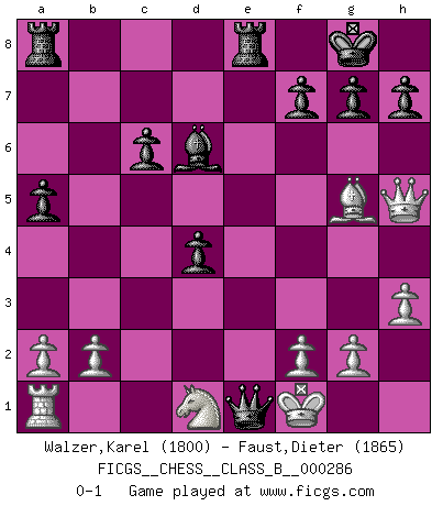 Last move : 0-1 2018 December 22 17:44:5 [Event "FICGS__CHESS__CLASS_B__000286"] [Site "FICGS"] [Date "2018.09.25"] [Round "1"] [White "Walzer,Karel"] [Black "Faust,Dieter"] [Result "0-1"] [WhiteElo "1800"] [BlackElo "1865"] 1.d4 e6 2.e3 Nf6 3.c4 c5 4.Bd3 Nc6 5.Ne2 Be7 6.O-O O-O 7.d5 exd5 8.cxd5 Nxd5 9.Be4 Nf6 10.Bxc6 bxc6 11.h3 a5 12.Nbc3 Ba6 13.Qc2 d5 14.Nf4 Bxf1 15.Kxf1 Bd6 16.Qf5 Re8 17.Nh5 Nxh5 18.Qxh5 d4 19.exd4 cxd4 20.Nd1 Qe7 21.Bg5 Qe1+ 0-1 Queen's pawn Kingside Castling by player White (move 6) Kingside Castling by player Black (move 6) Player Black won this chess game. Follow this game move after move (download)Half the variations which are calculated in a tournament game turn out to be completely superfluous. Unfortunately, no one knows in advance which half. (Jan Tinman) Im Wettkampf zwischen starken Meistern kommen Fehler sehr selten vor, deshalb ist es mit bloßem Warten nicht getan. (José Raúl Capablanca) No volvere nunca a jugar contigo. Has insultado a mi amigo. - cuando un oponente se maldijo por una mala jugada (Miguel Najdorf) En blitz, le Cavalier l'emporte sur le Fou. (Vlastimil Hort) Panic is a sudden desertion of us, an a going over to the enemy of our imagination. (Christian Nevell Bovee)
