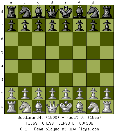 Last move : 0-1 2018 November 4 21:48:33 [Event "FICGS__CHESS__CLASS_B__000286"] [Site "FICGS"] [Date "2018.09.25"] [Round "1"] [White "Boediman,Matheus Ronald"] [Black "Faust,Dieter"] [Result "0-1"] [WhiteElo "1800"] [BlackElo "1865"] 0-1 This chess game has been lost on time (started : 2018.09.25 17:39:40) Player Black won this chess game. Follow this game move after move (download)What would Chess be without silly mistakes ? (Kurt Richter) Ich verstehe mehr vom Schach als irgendein anderer lebender Meister. (José Raúl Capablanca) Una partida de Ajedrez se divide en 3 etapas: la primera cuando piensas que tienes la ventaja, la segunda cuando crees que tienes la ventaja y la tercera... ¡cuando te das cuenta que vas a perder!. (Savielly Tartakower) Vous n'êtes pas toujours obligé de jouer le meilleur coup. Un coup doit être actif, entreprenant, correct et beau ! (David Bronstein) Opportunities multiply as they are seized. (Sun Tzu)