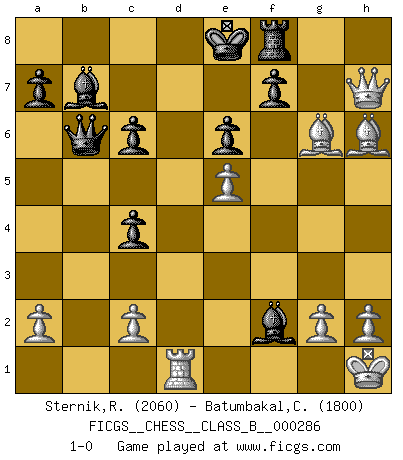 Last move : 1-0 2019 January 11 4:46:17 [Event "FICGS__CHESS__CLASS_B__000286"] [Site "FICGS"] [Date "2018.09.25"] [Round "1"] [White "Sternik,Ryszard"] [Black "Batumbakal,Cardo"] [Result "1-0"] [WhiteElo "2060"] [BlackElo "1800"] 1.e4 c5 2.Nf3 e6 3.d4 cxd4 4.Nxd4 Nf6 5.Nc3 Bb4 6.e5 Nd5 7.Bd2 Nxc3 8.bxc3 Bf8 9.Bd3 d6 10.Qe2 Nc6 11.Nxc6 bxc6 12.O-O d5 13.c4 Be7 14.Qg4 dxc4 15.Qxg7 Rf8 16.Be4 Bb7 17.Rfd1 Qc7 18.Bh6 Rd8 19.Rab1 Rxd1+ 20.Rxd1 Qb6 21.Qxh7 Bc5 22.Bg6 Bxf2+ 23.Kh1 1-0 Sicilian : Pin, Koch variation Kingside Castling by player White (move 12) Player White won this chess game. Follow this game move after move (download)I played Chess with him and would have beaten him sometimes only he always took back his last move, and ran the game out differently. (Mark Twain) Wenn sie aufgeben, dann danke ich Ihnen für das Spiel (Eventualzug beim Fernschach). (Anonymous) La pasion por jugar al Ajedrez es una de las mas inexplicables en el mundo. (H.G. Wells) La conception d'un plan est le processus par lequel un joueur exploite les avantages de sa position tout en s'efforçant d'en réduire au minimum les inconvénients. Afin de garantir le succès, un plan doit toujours se fonder sur un diagnostic objectif des particularités d'une position. La conception d'un plan est d'autant plus difficile que la position est équilibrée, et grandement facilitée lorsqu'il n'existe qu'un seul plan susceptible de répondre aux exigences de la position. (Harry Golombek) I have opinions of my own - strong opinions - but I don't always agree with them. (George Bush)