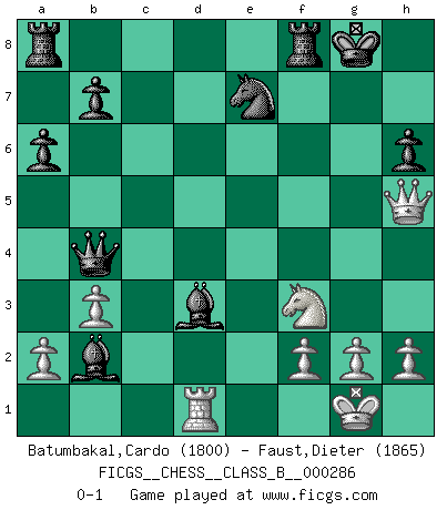 Last move : 0-1 2019 February 27 21:54:5 [Event "FICGS__CHESS__CLASS_B__000286"] [Site "FICGS"] [Date "2018.09.25"] [Round "1"] [White "Batumbakal,Cardo"] [Black "Faust,Dieter"] [Result "0-1"] [WhiteElo "1800"] [BlackElo "1865"] 1.b3 c5 2.Bb2 Nc6 3.e4 e6 4.Nf3 a6 5.Be2 d5 6.exd5 exd5 7.d4 Be7 8.O-O Bf6 9.c4 dxc4 10.Bxc4 Nge7 11.Re1 O-O 12.Qe2 cxd4 13.Nbd2 d3 14.Bxd3 Bxb2 15.Rad1 Qc7 16.Ng5 h6 17.Qh5 Ne5 18.Rxe5 Qxe5 19.Ndf3 Qf4 20.Nh3 Qb4 21.Nhg5 Bf5 22.Nxf7 Bxd3 23.Nxh6+ gxh6 0-1 Nimzovich-Larsen attack : English variation Kingside Castling by player White (move 8) Kingside Castling by player Black (move 11) Player Black won this chess game. Follow this game move after move (download)Help your pieces so they can help you. (Paul Morphy) Kritik überlasse ich den Spießern. Ich zeige nichts, wofür ich mich schämen muss. (Alexandra Kosteniuk) Para mi, el Ajedrez es la vida y cada partida es como una nueva vida. Todo jugador de Ajedrez suele vivir muchas vidas durante su vida. (Eduard Gufeld) Les écrivains ont utilisé les échecs pour analyser les côtés extrêmes de la nature humaine. Dans ce cadre, les échecs offrent un champ d'expérimentation idéal. Mais on pourrait faire la même chose avec la peinture. Et là, en vous référant à Van Gogh, vous ne tirerez pas de conclusion définitive sur les peintres. (Gary Kasparov) Winning isn't everything... but losing is nothing. (Mednis)
