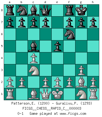 Last move : 0-1 2006 July 27 15:2:57 [Event "FICGS__CHESS__RAPID_C__000003"] [Site "FICGS"] [Date "2006.06.08"] [Round "1"] [White "Patterson,Eddie"] [Black "Guralivu,Paul-Iosif"] [Result "0-1"] [WhiteElo "1200"] [BlackElo "1293"] 1.c4 e5 2.g3 Nf6 3.Bg2 Bc5 4.Nc3 O-O 0-1 This chess game has been lost on time (started : 2006.06.08 0:34:51) English Opening Kingside Castling by player Black (move 4) Player Black won this chess game. Follow this game move after move (download)A chess genius has died; a loss for humanity. (Viktor Kortchnoi, about Bobby Fischer's death) Mein Gehirn das ist mein zweitwichtigstes Organ [Aus dem Film: Der Schläfer]. (Woody Allen) Cada Peón es potencialmente una Reina. (James Mason) Karpov est une pièce de musée. (Garry Kasparov) At last I discovered the true beauty of chess. So I proposed to her. (Dinesh De Silva)
