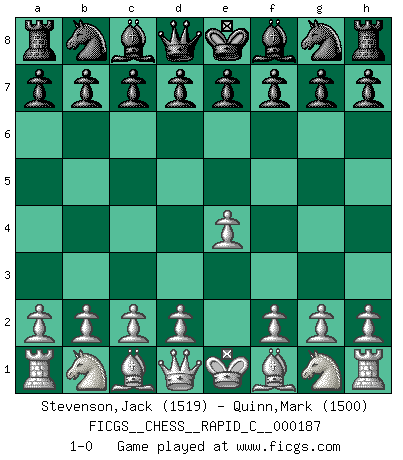 Last move : 1-0 2018 October 26 10:0:21 [Event "FICGS__CHESS__RAPID_C__000187"] [Site "FICGS"] [Date "2018.09.26"] [Round "1"] [White "Stevenson,Jack"] [Black "Quinn,Mark"] [Result "1-0"] [WhiteElo "1519"] [BlackElo "1500"] 1.e4 1-0 This chess game has been lost on time (started : 2018.09.26 5:53:40) King's pawn Opening Player White won this chess game. Follow this game move after move (download)I play correspondence chess because it is both art and science while chess is art only. (A player at FICGS) Die starken Figuren des Gegners muss man abtauschen. (José Raúl Capablanca) El Ajedrez demanda una total concentración. (Bobby Fischer) Même si l'adversaire joue le coup analysé précédemment, recommencez l'analyse en voyant la nouvelle position. Première règle de Blumenfeld Quotation,n.: The act of repeating erroneously the words of another. The words erroneously repeated. (Ambrose Bierce, The Devil's Dictionary)