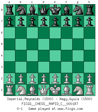 Last move : 0-1 2018 October 26 10:0:21 [Event "FICGS__CHESS__RAPID_C__000187"] [Site "FICGS"] [Date "2018.09.26"] [Round "1"] [White "Imperial,Reynaldo"] [Black "Nagy,Gyula"] [Result "0-1"] [WhiteElo "1500"] [BlackElo "1500"] 0-1 This chess game has been lost on time (started : 2018.09.26 5:53:40) Player Black won this chess game. Follow this game move after move (download)There are tough players and nice guys, and I'm a tough player. (Bobby Fischer) Habe Mut, dich deines eigenen Verstandes zu bedienen. (Immanuel Kant) Coloca el contenido de las piezas del Ajedrez en un sombrero, agitalo vigorosamente, arrojalas en un tablero desde una altura de 30 centimetros y así obtendras el estilo de Steinitz. (H. E. Bird) Les échecs, c'est l'imagination. (David Bronstein) Computer Science is no more about computers than astronomy is about telescopes. (Edsger W. Dijkstra)