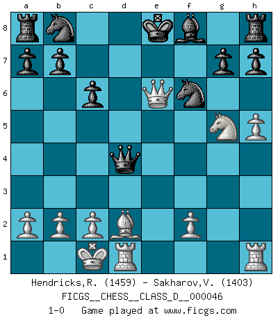 Last move : 1-0 2007 June 8 16:27:0 [Event "FICGS__CHESS__CLASS_D__000046"] [Site "FICGS"] [Date "2007.05.19"] [Round "1"] [White "Hendricks,Richard"] [Black "Sakharov,Vitalij"] [Result "1-0"] [WhiteElo "1459"] [BlackElo "1403"] 1.e4 c6 2.d4 d5 3.Nc3 dxe4 4.Nxe4 Bf5 5.Ng3 Bg6 6.Nf3 e6 7.h4 Nf6 8.h5 Be4 9.Ng5 Bf5 10.Nxf5 Qa5+ 11.Bd2 Qxf5 12.Bd3 Qd5 13.Qe2 Qxg2 14.O-O-O Qd5 15.Bc4 Qxd4 16.Bxe6 fxe6 17.Qxe6+ 1-0 Caro-Kann : Classical variation Queenside Castling by player White (move 14) Player White won this chess game. Follow this game move after move (download)There just isn't enough televised Chess. (David Letterman) Im Wettkampf zwischen starken Meistern kommen Fehler sehr selten vor, deshalb ist es mit bloßem Warten nicht getan. (José Raúl Capablanca) En un gambito tu regalas un Peón por el bién de tomar un juego perdido. (Samuel Standige Boden) Le plus grand jeu de l'esprit jamais inventé, plus vous l'apprenez, plus vous y prenez du plaisir. (Garry Kasparov) You cannot beat a roulette table unless you steal money from it. (Albert Einstein)