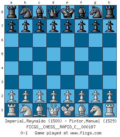 Last move : 0-1 2018 October 26 10:0:21 [Event "FICGS__CHESS__RAPID_C__000187"] [Site "FICGS"] [Date "2018.09.26"] [Round "1"] [White "Imperial,Reynaldo"] [Black "Pintor,Manuel"] [Result "0-1"] [WhiteElo "1500"] [BlackElo "1529"] 0-1 This chess game has been lost on time (started : 2018.09.26 5:53:40) Player Black won this chess game. Follow this game move after move (download)Mistrust is the most necessary characteristic of the Chess player. (Siegbert Tarrasch) Ich kenne keine einzige Person, die behaupten würde, Garri Kasparow sei ein guter Mensch (Nigel Short) Un Peón pasado aumenta su poder a medida de que el número de piezas en el tablero disminuye. (Capablanca) Tout change constamment, y compris dans le monde des Echecs. (Botvinnik) If everyone is thinking alike, then somebody isn't thinking. (US General George S. Patton)