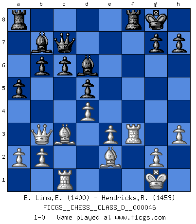 Last move : 1-0 2007 July 6 19:15:32 [Event "FICGS__CHESS__CLASS_D__000046"] [Site "FICGS"] [Date "2007.05.19"] [Round "1"] [White "B. Lima,Edmilson"] [Black "Hendricks,Richard"] [Result "1-0"] [WhiteElo "1400"] [BlackElo "1459"] 1.d4 Nf6 2.c4 e6 3.Nf3 b6 4.e3 Bb7 5.Bd3 d5 6.O-O Bd6 7.cxd5 exd5 8.Bd2 O-O 9.Nc3 Ne4 10.Nb5 Be7 11.Qc2 c6 12.Nc3 f5 13.Rad1 Nd7 14.Qb3 Ndf6 15.Ne5 Bd6 16.Nxe4 fxe4 17.Be2 Qe7 18.Bc3 Nd7 19.Nxd7 Qxd7 20.Rc1 Qc7 21.h3 a5 22.f3 exf3 23.Rxf3 1-0 Queen's Indian : 4.e3 Kingside Castling by player White (move 6) Kingside Castling by player Black (move 8) Player White won this chess game. Follow this game move after move (download)Chess is a beautiful mistress. (Bent Larsen) Ein unbeabsichtigtes Patt ist der Gipfel der Dummheit. (Anonymous) El poder defensivo de una pieza clavada, solamente es imaginario. (Aaron Nimzovich) Les ravages du H expliquent la différence de niveau entre Tal et Thal [Abergel]. Art is not a thing, it is a way. (Elbert Hubbard)