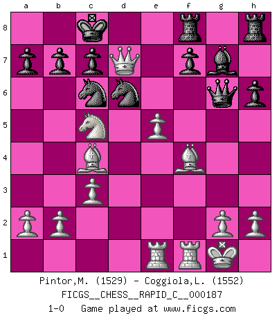 Last move : 1-0 2018 October 9 18:47:55 [Event "FICGS__CHESS__RAPID_C__000187"] [Site "FICGS"] [Date "2018.09.26"] [Round "1"] [White "Pintor,Manuel"] [Black "Coggiola,Leandro Damian"] [Result "1-0"] [WhiteElo "1529"] [BlackElo "1552"] 1.e4 e5 2.f4 exf4 3.Nf3 g5 4.Bc4 g4 5.O-O gxf3 6.Qxf3 Qf6 7.c3 Nc6 8.d4 d6 9.Bxf4 Bd7 10.e5 dxe5 11.dxe5 Qf5 12.Nd2 O-O-O 13.Nb3 Bg7 14.Rae1 Nge7 15.Qg3 Qg6 16.Bg5 Rdf8 17.Nc5 h6 18.Bf4 Nf5 19.Qh3 Nd6 20.Qxd7+ 1-0 KGA : Muzio gambit Kingside Castling by player White (move 5) Queenside Castling by player Black (move 12) Player White won this chess game. Follow this game move after move (download)If a ruler does not understand Chess, how can he rule over a kingdom ? (King Khusros II) Stelle das Brett so, daß die Sonne in die Augen deines Gegners scheint. (Ruy López) Yo tuve un dolor de muelas en la primer partida. En el segundo juego, tuve un dolor de cabeza. En el tercero, tuve un ataque de reumatísmo. En la cuarta partida, no me sentía muy bien. ¿Y en el quinto juego? Bueno, ¿que acaso uno tiene que ganar todos los juegos?. (Siegbert Tarrasch) D'abord les bases : Jouez et étudiez, puis étudiez et jouez, ensuite jouez et étudiez, puis étudiez et jouez. Deuxièmement : Donnez toujours le meilleur de vous-même ! (Ken Smith) If we knew what we were doing, we would not call it research. (Albert Einstein)