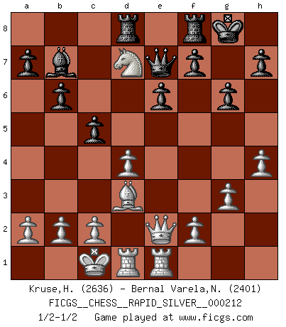 Last move : 1/2-1/2 2018 October 17 10:48:59 [Event "FICGS__CHESS__RAPID_SILVER__000212"] [Site "FICGS"] [Date "2018.09.26"] [Round "1"] [White "Kruse,Herbert"] [Black "Bernal Varela,Nelson"] [Result "1/2-1/2"] [WhiteElo "2636"] [BlackElo "2401"] 1.e4 e6 2.d4 d5 3.Nc3 Nf6 4.Bg5 dxe4 5.Nxe4 Be7 6.Bxf6 Bxf6 7.Nf3 Nd7 8.Qd2 O-O 9.O-O-O b6 10.Nxf6+ Nxf6 11.Bd3 Bb7 12.Ne5 Qe7 13.Rhe1 Rad8 14.g3 Nd7 15.Qe2 g6 16.h4 c5 17.Nxd7 1/2-1/2 French : Burn variation Kingside Castling by player Black (move 8) Queenside Castling by player White (move 9) This chess game ended in a draw. Follow this game move after move (download)Botvinnik tried to take the mystery out of Chess, always relating it to situations in ordinary life. He used to call Chess a typical inexact problem similar to those which people are always having to solve in everyday life. (Garry Kasparov) Über Karpov: Er war und ist ein Vertreter der russischen Reaktionäre. Das steckt tief in seiner Seele, wehalb ich nicht nett mit ihm umgehen kann. (Viktor Kortschnoi) Por tratar de evitar la pérdida de una pieza, muchas personas han perdido una partida de Ajedrez. (Savielly Tartakover) Pour moi, les échecs ne sont pas un jeu mais un art. (Alexandre Alekhine) Everybody lies. (Gregory House, House M.D.)