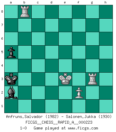 Last move : 1-0 2019 January 2 8:52:35 [Event "FICGS__CHESS__RAPID_A__000223"] [Site "FICGS"] [Date "2018.09.26"] [Round "1"] [White "Anfruns,Salvador"] [Black "Salonen,Jukka"] [Result "1-0"] [WhiteElo "1982"] [BlackElo "1930"] 1.e4 e5 2.Nf3 Nc6 3.Bb5 d6 4.d4 Bd7 5.Nc3 Nf6 6.Bxc6 Bxc6 7.Qe2 exd4 8.Nxd4 Bd7 9.Bf4 Be7 10.O-O-O O-O 11.Rhg1 c6 12.g4 d5 13.Nf5 Re8 14.e5 Bb4 15.Bg5 Qc7 16.Bxf6 gxf6 17.Nh6+ Kf8 18.g5 f5 19.Nxf7 Bxc3 20.Qh5 Bxe5 21.g6 Be6 22.Nxe5 Qxe5 23.gxh7 Qf4+ 24.Kb1 Ke7 25.Rde1 Kd7 26.Rg7+ Kd6 27.Qe2 Qe4 28.Qd2 Qh4 29.Rxb7 Bd7 30.Rg1 Rad8 31.Rg6+ Re6 32.Rg8 Rde8 33.b3 Re1+ 34.Kb2 Qxh7 35.Qf4+ R8e5 36.Qg3 f4 37.Rg6+ Ke7 38.Qg4 Kd8 39.Rg8+ Re8 40.Rb8+ Kc7 41.Qxf4+ R8e5 42.Qb4 Qxc2+ 43.Kxc2 R5e2+ 44.Kc3 d4+ 45.Qxd4 Rc1+ 46.Kd3 Rd1+ 47.Kxe2 Rxd4 48.Rbf8 c5 49.Rg7 Kc6 50.Rf6+ Kb5 51.Ke3 Rd1 52.h4 c4 53.bxc4+ Kb4 54.h5 Be6 55.h6 Rh1 56.h7 Bxc4 57.Rf8 a5 58.h8Q Rxh8 59.Rxh8 Ka3 60.Rg3 Bxa2 61.Rb8 1-0 Ruy Lopez : Old Steinitz defense, Nimzovich attack Queenside Castling by player White (move 10) Kingside Castling by player Black (move 10) 10 pieces endgame at move 56 : White KRRPPP , Black KRBP WHITE : King + 2 Rooks 3 Pawns BLACK : King + 1 Rook 1 Bishop 1 Pawn Promotion Queen by player White (move 58) 9 pieces endgame at move 58 : White KRRPP , Black KRBP WHITE : King + 2 Rooks 2 Pawns BLACK : King + 1 Rook 1 Bishop 1 Pawn 8 pieces endgame at move 59 : White KRRPP , Black KBP WHITE : King + 2 Rooks 2 Pawns BLACK : King + 1 Bishop 1 Pawn 7 pieces endgame at move 60 : White KRRP , Black KBP WHITE : King + 2 Rooks 1 Pawn BLACK : King + 1 Bishop 1 Pawn Player White won this chess game. Follow this game move after move (download)The boy (then a 12 year old boy named Anatoly Karpov) doesn't have a clue about Chess, and there's no future at all for him in this profession. (Mikhail Botvinnik) Wenn Du nicht kämpfst, um anderen etwas zu beweisen, sondern nur für Dich selbst, dann bist du fast unbesiegbar. (Garry Kasparov) Si un gobernante no entiende al Ajedrez, ¿como puede governar él un reinado?. (El Rey Khusros II) Même un GMI sait rarement calculer sur plus de cinq coups une attaque à sacrifices. (Rudolf Spielmann) Crush them ! Make them suffer ! (General Grievous in Star Wars ep.3)