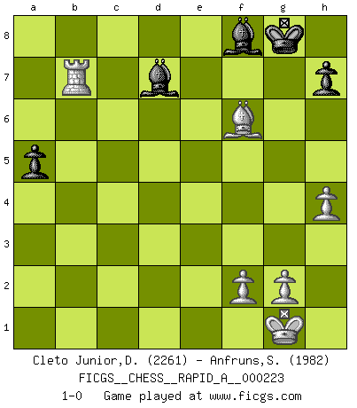 Last move : 1-0 2018 October 4 21:55:59 [Event "FICGS__CHESS__RAPID_A__000223"] [Site "FICGS"] [Date "2018.09.26"] [Round "1"] [White "Cleto Junior,Dirceu"] [Black "Anfruns,Salvador"] [Result "1-0"] [WhiteElo "2261"] [BlackElo "1982"] 1.d4 Nf6 2.c4 e6 3.Nf3 b6 4.a3 Bb7 5.Nc3 d5 6.cxd5 Nxd5 7.e3 Nxc3 8.bxc3 Be7 9.Bb5+ c6 10.Bd3 c5 11.e4 O-O 12.O-O cxd4 13.cxd4 Nc6 14.Be3 Rc8 15.Qe2 Na5 16.Rfd1 Rc3 17.a4 Nb3 18.Rab1 Qd6 19.d5 exd5 20.exd5 Nc5 21.Bc4 Nxa4 22.Bd4 Rc8 23.Bb3 Rxb3 24.Rxb3 Bxd5 25.Re3 Bf8 26.Ne5 f6 27.Ng4 Kh8 28.h4 f5 29.Qa6 Ra8 30.Nf6 gxf6 31.Qxa4 Bh6 32.Re8+ Rxe8 33.Qxe8+ Bg8 34.Qh5 Bg7 35.Qxf5 a5 36.Qg4 Qe6 37.Qxe6 Bxe6 38.Rb1 Kg8 39.Rxb6 Bd7 40.Bxf6 Bf8 41.Rb7 1-0 Queen's Indian : Petrosian system Kingside Castling by player Black (move 11) Kingside Castling by player White (move 12) Player White won this chess game. Follow this game move after move (download)Chess is a more highly symbolic game, but the aggressions are therefore even more frankly represented in the play. It probably began as a war game; that is, the representation of a miniature battle between the forces of two kingdoms. (Karl Meninger) Mein erstes Ziel war nicht, die Partie zu gewinnen, sondern eine Figur zu opfern. -- der junge (Wilhelm Steinitz) Hasta este punto, las blancas han seguido un análisis bien conocido. Pero ahora el hace un error fatal: empieza a usar su propia cabeza. (Siegbert Tarrasch) La vérité est comme le meilleur coup aux échecs : elle existe, mais il faut la chercher. (Arturo Perez-Reverte) The right perception of any matter and a misunderstanding of the same matter do not wholly exclude each other. (Kafka's the trial)