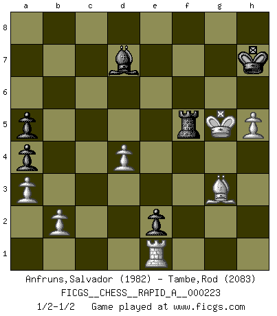 Last move : 1/2-1/2 2018 December 9 17:12:42 [Event "FICGS__CHESS__RAPID_A__000223"] [Site "FICGS"] [Date "2018.09.26"] [Round "1"] [White "Anfruns,Salvador"] [Black "Tambe,Rod"] [Result "1/2-1/2"] [WhiteElo "1982"] [BlackElo "2083"] 1.e4 c5 2.Nf3 d6 3.d4 cxd4 4.Nxd4 Nf6 5.Nc3 a6 6.g3 e5 7.Nb3 Be7 8.Bg2 O-O 9.O-O Bg4 10.f3 Be6 11.f4 exf4 12.gxf4 Re8 13.h3 Nbd7 14.Nd4 Rc8 15.Be3 Qc7 16.Kh1 Bd8 17.Qf3 b5 18.a3 Nc5 19.Rfe1 Bd7 20.Bf2 g6 21.Rad1 Na4 22.Nxa4 bxa4 23.c3 Rb8 24.Rd2 Bc8 25.Qd3 Bb7 26.Bf3 d5 27.e5 Ne4 28.Bxe4 dxe4 29.Qe3 f6 30.e6 Qa5 31.Kg1 Bc7 32.f5 Qe5 33.Bh4 Qf4 34.Qxf4 Bxf4 35.Rf2 Be5 36.fxg6 Bxd4 37.cxd4 Rxe6 38.gxh7+ Kxh7 39.Rxf6 Rg8+ 40.Kh2 Rxf6 41.Bxf6 e3 42.Rg1 e2 43.Bh4 Rb8 44.Be7 a5 45.Bd6 Rd8 46.Bc7 Rd5 47.Be5 Rd7 48.h4 Rf7 49.Re1 Rf2+ 50.Kg3 Rf3+ 51.Kg4 Rf1 52.Bg3 Bc8+ 53.Kg5 Rf5+ 54.Kg4 Rf2 55.Kg5 Rf5+ 56.Kg4 Rf1 57.Kg5 Bd7 58.h5 Rf5+ 59.Kg4 Rf8 60.Kg5 Rf5+ 61.Kg4 Rf8 62.Kg5 Rf5+ 1/2-1/2 Sicilian : Najdorf, Zagreb (Fianchetto) variation Kingside Castling by player Black (move 8) Kingside Castling by player White (move 9) This chess game ended in a draw. Follow this game move after move (download)Chess is everything: art, science and sport. (Anatoly Karpov) Darum geht es im Schach. Einen Tag gibst du deinem Gegner eine Lektion, am nächsten Tag gibt er dir eine. (Robert James Fischer) Fischer deseaba darle a los Rusos una sopa de su propia medicina. (Larry Evans) Nous sommes les pions de la mystérieuse partie d'Echecs jouée par Dieu. Il nous déplace, nous arrête, nous pousse encore, puis nous lance un à un dans la boîte du Néant. Epitaphe sur la tombe de David Janowsky (1868-1927). I have opinions of my own - strong opinions - but I don't always agree with them. (George Bush)