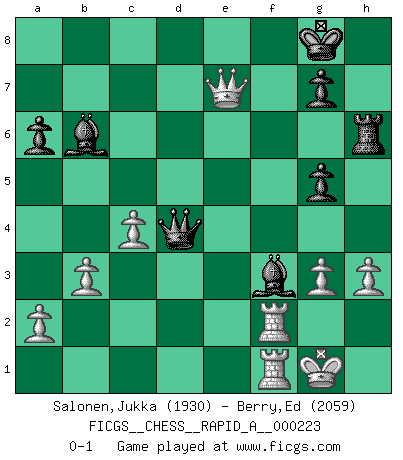 Last move : 0-1 2018 November 2 9:40:1 [Event "FICGS__CHESS__RAPID_A__000223"] [Site "FICGS"] [Date "2018.09.26"] [Round "1"] [White "Salonen,Jukka"] [Black "Berry,Ed"] [Result "0-1"] [WhiteElo "1930"] [BlackElo "2059"] 1.e4 e5 2.Nf3 Nc6 3.Bb5 f5 4.Nc3 fxe4 5.Nxe4 Nf6 6.Nxf6+ Qxf6 7.O-O Be7 8.Qe2 O-O 9.Qe4 d6 10.Bxc6 bxc6 11.d4 Bf5 12.Qxc6 Qg6 13.Qxc7 Bd8 14.Qc4+ Be6 15.Qc6 Rc8 16.Qxd6 Bc7 17.Qa3 Bd5 18.Qd3 e4 19.Qb5 Qe6 20.Ng5 Qd6 21.g3 h6 22.b3 a6 23.Qa4 hxg5 24.Ba3 Qe6 25.Bxf8 e3 26.c4 Bf3 27.fxe3 Qxe3+ 28.Rf2 Rxf8 29.Qa3 Qxd4 30.Raf1 Bb6 31.Qe7 Rf6 32.h3 Rh6 0-1 Ruy Lopez : Schliemann defense, Berger variation Kingside Castling by player White (move 7) Kingside Castling by player Black (move 8) Player Black won this chess game. Follow this game move after move (download)The tactician must know what to do whenever something needs doing; the strategist must know what to do when nothing needs doing. (Savielly Tartakover) Oft bringt ein stiller Zug das Erdbeben. (Richard Reti) Dios mío, Bobby Fischer juega tan simple. (Alexei Suetin) Soyez une menace à chaque fois que vous vous asseyez pour jouer. (Ken Smith) Chess is everything: art, science and sport. (Anatoly Karpov)