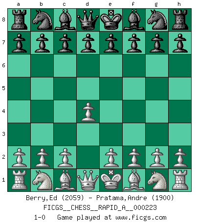 Last move : 1-0 2018 October 26 22:1:9 [Event "FICGS__CHESS__RAPID_A__000223"] [Site "FICGS"] [Date "2018.09.26"] [Round "1"] [White "Berry,Ed"] [Black "Pratama,Andre"] [Result "1-0"] [WhiteElo "2059"] [BlackElo "1900"] 1.d4 1-0 This chess game has been lost on time (started : 2018.09.26 10:7:10) Queen's pawn Player White won this chess game. Follow this game move after move (download)Not all artists are Chess players, but all Chess players are artists. (Marcel Duchamp) Lisa Lane, amerikanische Schachmeisterin, hatte Fischer einmal als stärksten lebenden Spieler bezeichnet. Antwort: Das ist richtig, aber Lisa Lane ist eigentlich nicht in der Lage, das zu beurteilen. (Robert James Fischer) Ciertamente, de todas la drogas del mundo, el Ajedrez debe ser el mas placentero permamentemente. (Assiac) Aidez vos pièces, elles vous aideront. (Paul Morphy) There's always a bigger fish. (Qui-Gon Jinn in Star Wars ep.1)
