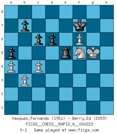 Last move : 0-1 2019 January 16 6:54:8 [Event "FICGS__CHESS__RAPID_A__000223"] [Site "FICGS"] [Date "2018.09.26"] [Round "1"] [White "Vasquez,Fernando"] [Black "Berry,Ed"] [Result "0-1"] [WhiteElo "1951"] [BlackElo "2059"] 1.e4 e5 2.Nf3 Nc6 3.d4 exd4 4.Nxd4 Bc5 5.Be3 Qf6 6.c3 d6 7.Be2 Nge7 8.O-O Bd7 9.f4 O-O-O 10.Qd2 Rhe8 11.Bf3 Qg6 12.Na3 f5 13.Nxf5 Nxf5 14.Bxc5 Nh4 15.f5 Qf6 16.Be3 h6 17.Bd4 Nxf3+ 18.gxf3 Qf7 19.Qg2 Ne7 20.c4 g6 21.f6 Nc6 22.Bc3 g5 23.b3 Ne5 24.Rad1 Qh5 25.Rf2 Ng6 26.Qf1 Nf4 27.Kh1 Rg8 28.R1d2 Nh3 29.Rg2 g4 30.Rd5 Qh4 31.f7 Rgf8 32.fxg4 Qe7 33.Rf5 Bxf5 34.exf5 Qe4 35.Bf6 Rd7 36.Nb1 Nf4 37.Nc3 Qxg2+ 38.Qxg2 Nxg2 39.Kxg2 Rdxf7 40.Bh4 Rg7 41.Kf3 h5 42.h3 hxg4+ 43.hxg4 Rfg8 44.g5 Rxg5 45.Bxg5 Rxg5 46.Kf4 Rg2 47.Kf3 Rg8 48.Ne4 Rg1 49.Kf4 Kd7 50.Nf6+ Kd8 51.Nd5 a5 52.f6 Kd7 53.Kf5 Rg2 54.a4 Rf2+ 55.Kg5 c6 56.Nf4 Rf3 57.Ne2 Ke8 58.Nd4 Rd3 59.Ne6 Re3 60.Nd4 Kf7 61.Nf5 Re5 0-1 Scotch game Kingside Castling by player White (move 8) Queenside Castling by player Black (move 9) Player Black won this chess game. Follow this game move after move (download)I like to say that Bobby Fischer was the greatest player ever. But what made Fischer a genius was his ability to blend an American freshness and pragmatism with Russian ideas about strategy. (Bruce Pandolfini) Obwohl ich vom Stil her kaum zu den Priestern der Schachkunst gezählt werde, halte ich Schach doch für eine Kunst. (Tigran Petrosjan) Aquellos que dicen entender al Ajedrez, no entienden nada. (Robert Hubner) La solitude du joueur d'Echecs à l'approche du mat est semblable à celle du condamné. (Francis Szpiner) The meaning of life is that it is to be lived, and it is not to be traded and conceptualized and squeezed into a pattern of systems. (Bruce Lee)