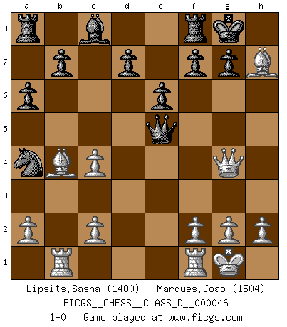 Last move : 1-0 2007 June 21 13:23:51 [Event "FICGS__CHESS__CLASS_D__000046"] [Site "FICGS"] [Date "2007.05.19"] [Round "1"] [White "Lipsits,Sasha"] [Black "Marques,Joao"] [Result "1-0"] [WhiteElo "1400"] [BlackElo "1504"] 1.e4 c5 2.Nf3 e6 3.d4 cxd4 4.Nxd4 Nf6 5.Nc3 a6 6.e5 Ng8 7.Bf4 Bb4 8.Bd3 Ne7 9.O-O Bxc3 10.bxc3 Nd5 11.Bd2 Qc7 12.c4 Nb6 13.Ba5 Nc6 14.Nxc6 Qxc6 15.Qg4 O-O 16.Rab1 Na4 17.Be4 Qc5 18.Bb4 Qxe5 19.Bxh7+ 1-0 Sicilian : Anderssen variation Kingside Castling by player White (move 9) Kingside Castling by player Black (move 15) Player White won this chess game. Follow this game move after move (download)Nothing excites jaded Grandmasters more than a theoretical novelty. (Dominic Lawson) Versuche, dich von der Sklaverei der Eröffnungsvarianten zu befreien. Stattdessen soll man gewisse Typenpositionen erlernen, die man eingehend analysiert. (Aaron Nimzowitsch) Yo jugué Ajedrez con el y a veces le pude haber ganado solo que siempre devuelve su última jugada y juega la partida de manera diferente. (Mark Twain) Les réformistes prétendent que les progrès de la théorie conduiront à la disparition des échecs, et qu'il faut, pour leur rendre vie, en remanier les règles. En réalité, qu'exprime cette affirmation? Le mépris de l'intuition, de l'imagination et de tous les autres éléments qui font des échecs un art. (Alexander Alekhine) Are you threatening me, Master Jedi ? (Chancellor Palpatine in Star Wars ep.3)