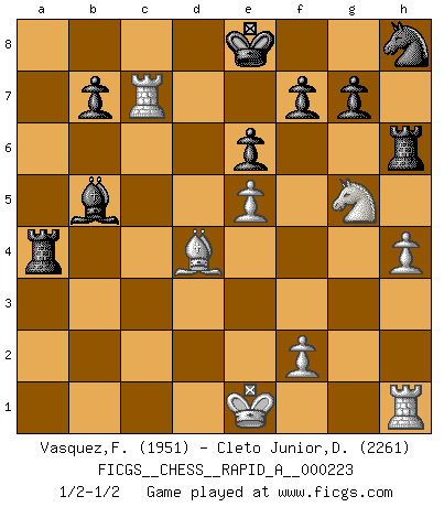 Last move : 1/2-1/2 2018 November 30 0:11:14 [Event "FICGS__CHESS__RAPID_A__000223"] [Site "FICGS"] [Date "2018.09.26"] [Round "1"] [White "Vasquez,Fernando"] [Black "Cleto Junior,Dirceu"] [Result "1/2-1/2"] [WhiteElo "1951"] [BlackElo "2261"] 1.e4 e6 2.d4 d5 3.e5 c5 4.c3 Qb6 5.Nf3 Nc6 6.a3 Nh6 7.b4 cxd4 8.cxd4 Nf5 9.Bb2 Bd7 10.g4 Nfe7 11.Nc3 Ng6 12.h4 h5 13.gxh5 Rxh5 14.Ng5 Rh6 15.b5 Na5 16.Qf3 Nh8 17.Na4 Qc7 18.Nc5 Bxc5 19.dxc5 a6 20.a4 Qxc5 21.Rc1 Nc4 22.Bxc4 Qb4+ 23.Qc3 Qxc4 24.Qxc4 dxc4 25.Rxc4 axb5 26.axb5 Bxb5 27.Rc7 Ra2 28.Bd4 Ra4 1/2-1/2 French : Advance variation This chess game ended in a draw. Follow this game move after move (download)During a Chess competition a Chessmaster should be a combination of a beast of prey and a monk. (Alexander Alekhine) Ich verstehe den Grund nicht, warum die Aufteilung in Frauen und Männer überhaupt im Schach besteht. (Judith Polgar) Con o sin el título, Bobby Fischer fue sin lugar a dudas el mas grande jugador de su época. (Burt Hochberg) Ce qui caractérise les parties de combat, c'est que si le défenseur a constamment de difficiles problèmes à résoudre, l'attaquant doit chercher sans relâche de nouvelles possibilités d'attaque. (Koblentz) I've lost money so fast in these clubs it's left me reeling. I've read every poker book ever written, but the only way to get better at the game is to go out and play with people who are really good. The problem is, you stand to lose a lot of money doing it. (Matt Damon)