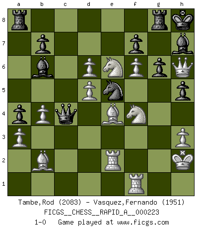 Last move : 1-0 2018 December 30 2:19:4 [Event "FICGS__CHESS__RAPID_A__000223"] [Site "FICGS"] [Date "2018.09.26"] [Round "1"] [White "Tambe,Rod"] [Black "Vasquez,Fernando"] [Result "1-0"] [WhiteElo "2083"] [BlackElo "1951"] 1.c4 e5 2.g3 Nf6 3.Bg2 Bc5 4.Nc3 Nc6 5.d3 d6 6.e3 O-O 7.Nge2 Bf5 8.a3 a5 9.h3 h6 10.O-O Bb6 11.Kh2 Re8 12.b3 Qc8 13.Bb2 Ne7 14.Qd2 c6 15.e4 Bh7 16.f4 Qd7 17.Rad1 Ng6 18.d4 exf4 19.gxf4 a4 20.b4 Nh4 21.Ng3 Red8 22.Bh1 Bc7 23.d5 Qe7 24.f5 Nd7 25.Nce2 Qg5 26.Nf4 Ne5 27.Ngh5 g6 28.Qf2 Qe7 29.f6 Qd7 30.Qxh4 Kh8 31.Ng7 h5 32.Nge6 cxd5 33.exd5 Rg8 34.Qg5 Bd8 35.c5 Qb5 36.Be4 Qc4 37.Rde1 Qa2 38.Re2 Qc4 39.cxd6 Bb6 40.Qh6 1-0 English Opening Kingside Castling by player Black (move 6) Kingside Castling by player White (move 10) Player White won this chess game. Follow this game move after move (download)Only the player with the initiative has the right to attack. (Wilhelm Steinitz) Der Bart als Geschlechtszeichen mitten im Gesicht ist obszön. Daher gefällt er den Weibern. [Zugegeben, kein Schachzitat, aber unglaublich originell] (Arthur Schopenhauer) Cuando tu no sabes absolutamente que mas hacer, es tiempo de entrar en pánico. (John van der Wiel) Les Cavaliers se révèlent fort utiles dans les positions fermées. D'habitude, les Fous sont un peu plus forts que les Cavaliers dans les positions ouvertes. Qu'on le veuille ou non, il restera toujours des exceptions ! You lose, general Kenobi. (General Grievous in Star Wars ep.3)