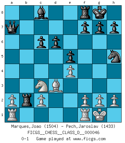 Last move : 0-1 2007 August 17 13:40:8 [Event "FICGS__CHESS__CLASS_D__000046"] [Site "FICGS"] [Date "2007.05.19"] [Round "1"] [White "Marques,Joao"] [Black "Pech,Jaroslav"] [Result "0-1"] [WhiteElo "1504"] [BlackElo "1433"] 1.e4 c5 2.Nf3 Nc6 3.d4 cxd4 4.Nxd4 Nf6 5.Nc3 e5 6.Nxc6 bxc6 7.Bd3 Be7 8.O-O O-O 9.Bg5 Rb8 10.Qf3 Rxb2 11.Qg3 Nh5 12.Bxe7 Qxe7 13.Qe3 d6 14.Qxa7 Qxa7 0-1 Sicilian : Pelikan (Lasker/Sveshnikov) variation Kingside Castling by player White (move 8) Kingside Castling by player Black (move 8) Player Black won this chess game. Follow this game move after move (download)A thorough understanding of the typical mating continuations makes the most complicated sacrificial combinations leading up to them not only not difficult, but almost a matter of course. (Siegbert Tarrasch) Ein Teil des Fehlers ist immer korrekt. (Savielly Grigorievitsch Tartakower) La estratégia requiere pensar, la táctica requiere observación. (Max Euwe) Dieu déplace le joueur, et celui-ci la pièce. Quel Dieu derrière Dieu commence donc la trame ? Arturo Perez-Reverte (prix de littérature policière 1993). Life doesn't imitate art, it imitates bad television. (Woody Allen)