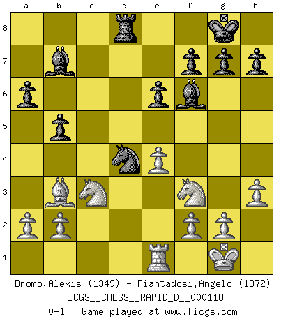 Last move : 0-1 2018 November 22 11:19:21 [Event "FICGS__CHESS__RAPID_D__000118"] [Site "FICGS"] [Date "2018.09.26"] [Round "1"] [White "Bromo,Alexis"] [Black "Piantadosi,Angelo"] [Result "0-1"] [WhiteElo "1349"] [BlackElo "1372"] 1.d4 d5 2.c4 e6 3.Nc3 Nf6 4.Nf3 dxc4 5.e4 c5 6.dxc5 Qxd1+ 7.Nxd1 Nc6 8.Bg5 Bxc5 9.Nc3 a6 10.Rd1 Be7 11.Bxf6 Bxf6 12.Bxc4 O-O 13.O-O b5 14.Bb3 Bb7 15.Rfe1 Rad8 16.Rxd8 Rxd8 17.h3 Nd4 0-1 This chess game has been lost on time (started : 2018.09.26 16:42:54) QGD : 4.Nf3 Kingside Castling by player Black (move 12) Kingside Castling by player White (move 13) Player Black won this chess game. Follow this game move after move (download)Chess is a beautiful mistress. (Bent Larsen) Man gibt nur Pakete auf. (Paul Keres) Aquellos que dicen que entienden al Ajedrez, no entienden nada. (Robert Hubner) Si je n'étais pas joueur d'échecs, je serais le meilleur dans quelque chose d'autre. (Anatoli Karpov) The Internet is the first thing that humanity has build that humanity doesn't understand, the largest experiment in anarchy that we have ever had. (Eric Schmidt)