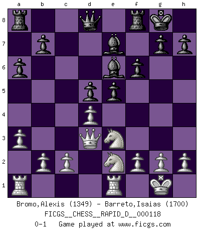 Last move : 0-1 2018 November 21 11:18:33 [Event "FICGS__CHESS__RAPID_D__000118"] [Site "FICGS"] [Date "2018.09.26"] [Round "1"] [White "Bromo,Alexis"] [Black "Barreto,Isaias"] [Result "0-1"] [WhiteElo "1349"] [BlackElo "1700"] 1.d4 Nf6 2.Nc3 d5 3.Bg5 e6 4.Nf3 Be7 5.Bxf6 Bxf6 6.e3 O-O 7.Bd3 c5 8.O-O cxd4 9.exd4 Nc6 10.Re1 Nb4 11.a3 Nxd3 12.Qxd3 a6 13.Ne5 Be7 14.Ne2 f6 15.Ng4 e5 16.Ne3 Be6 0-1 This chess game has been lost on time (started : 2018.09.26 16:42:54) Queen's pawn game Kingside Castling by player Black (move 6) Kingside Castling by player White (move 8) Player Black won this chess game. Follow this game move after move (download)What is the difference between chess and football? Everybody understands football, but nobody plays it. Everybody plays chess, but nobody understands it. Everything is relative. (Vladimir Kramnik) Es gibt zwei Arten von Opfern: Korrekte und meine. (Mikhail Nekhemyevich Tal) Todos los jugadores de Ajedrez deberían tener un pasatiempo. (Savielly Tartakower) Une platitude souvent récitée à propos des Echecs est qu'une des choses les plus difficiles à réaliser est de gagner une position gagnante. Cela ne manque pas de sens mais, pour ma part, j'ai toujours trouvé plus difficile de gagner une position perdante. (Tim Krabbe) Always two there are. No more no less. A master, and an apprentice. (Master Yoda in Star Wars ep.1)