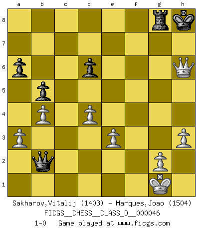 Last move : 1-0 2007 July 10 13:50:9 [Event "FICGS__CHESS__CLASS_D__000046"] [Site "FICGS"] [Date "2007.05.19"] [Round "1"] [White "Sakharov,Vitalij"] [Black "Marques,Joao"] [Result "1-0"] [WhiteElo "1403"] [BlackElo "1504"] 1.f4 c5 2.Nf3 e6 3.e3 Nf6 4.c3 d6 5.Bb5+ Bd7 6.Bxd7+ Nbxd7 7.O-O Be7 8.d4 cxd4 9.cxd4 O-O 10.Nc3 a6 11.a3 Qb6 12.b4 Rac8 13.Bb2 Rc7 14.h3 Rfc8 15.Rc1 Qa7 16.Qd3 h6 17.Na4 b5 18.Rxc7 Rxc7 19.Nc3 Nb6 20.Nd2 Nbd5 21.Nxd5 Nxd5 22.Ne4 Qb8 23.f5 Qc8 24.fxe6 fxe6 25.Rf2 Nf6 26.Nxf6+ Bxf6 27.Rxf6 gxf6 28.Qg6+ Rg7 29.Qxf6 Qc2 30.Qxe6+ Kh7 31.Qd5 Qxb2 32.Qf5+ Kh8 33.Qf8+ Rg8 34.Qxh6+ 1-0 Bird's Opening Kingside Castling by player White (move 7) Kingside Castling by player Black (move 9) Player White won this chess game. Follow this game move after move (download)One doesn't have to play well, it's enough to play better than your opponent. (Siegbert Tarrasch) Ein Gewinn durch eine ungenaue Kombination, sei sie auch noch so vorzeigbar, erfüllt mich mit Schaudern. (Wilhelm Steinitz) No solamente yo pronostico su triunfo sobre Botvinnik, sino que me adelanto y digo que probablemente Fischer es el jugador de Ajedrez mas grande que haya existido. (John Collins) Celui qui prend des risques peut perdre, celui qui n'en prend pas perd toujours. (Xavier Tartacover) Sometimes it pays to stay in bed in Monday, rather than spending the rest of the week debugging Monday's code. (Dan Salomon)