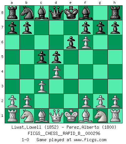 Last move : 1-0 2018 October 25 22:18:51 [Event "FICGS__CHESS__RAPID_B__000296"] [Site "FICGS"] [Date "2018.09.26"] [Round "1"] [White "Liwat,Lowell"] [Black "Perez,Alberto"] [Result "1-0"] [WhiteElo "1852"] [BlackElo "1800"] 1.d4 e6 2.e4 c5 3.c3 d5 4.e5 Nf6 5.exf6 1-0 Queen's pawn Player White won this chess game. Follow this game move after move (download)If you aren't afraid of Spassky, then I have removed the element of money. (Jim Slater) Schach verlangt totale Konzentration. (Robert James Fischer) Siempre es mejor sacrificar los hombres de tu oponente. (Savielly Tartakower) La vérité est comme le meilleur coup aux échecs : elle existe, mais il faut la chercher. (Arturo Perez-Reverte) When you stop learning you start dying. (Scott Adams)