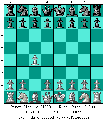 Last move : 1-0 2018 October 27 10:0:33 [Event "FICGS__CHESS__RAPID_B__000296"] [Site "FICGS"] [Date "2018.09.26"] [Round "1"] [White "Perez,Alberto"] [Black "Rusev,Russi"] [Result "1-0"] [WhiteElo "1800"] [BlackElo "1700"] 1.c4 1-0 This chess game has been lost on time (started : 2018.09.26 22:51:13) English Opening Player White won this chess game. Follow this game move after move (download)A passed Pawn increases in strength as the number of pieces on the board diminishes. (Capablanca) Im Schach gibt es keinen Platz für Galanterie. (Irving Chernev) Botvinnik trataba de restarle el misterio al Ajedrez, siempre relacionandolo a situaciones de la vida ordinaria. El gustaba de llamar al Ajedrez un típico problema inexacto similar a aquellos de los cuales la gente siempre tiene que enfrentarse en la vida cotidiana. (Garry Kasparov) L'action d'une oeuvre littéraire se déroule sur un champ de bataille. Les masques et les types du drame moderne correspondent aux pièces du jeu d'échecs. L'intrigue correspond aux coups et aux gambits, c'est à dire aux techniques du jeu telles qu'utilisées et interprétées par les joueurs. Les tactiques et les péripéties [mouvements] correspondent aux coups exécutés par l'adversaire. (Viktor Shklovsky) The real danger is not that computers will begin to think like men, but that men will begin to think like computers. (Sydney J. Harris)