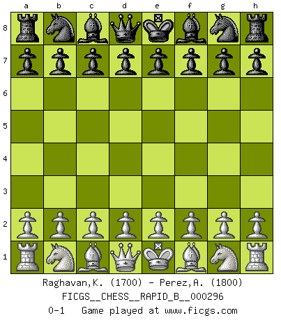 Last move : 0-1 2018 October 27 10:0:33 [Event "FICGS__CHESS__RAPID_B__000296"] [Site "FICGS"] [Date "2018.09.26"] [Round "1"] [White "Raghavan,Krisnamurthy"] [Black "Perez,Alberto"] [Result "0-1"] [WhiteElo "1700"] [BlackElo "1800"] 0-1 This chess game has been lost on time (started : 2018.09.26 22:51:13) Player Black won this chess game. Follow this game move after move (download)When your house is on fire, you can't be bothered with the neighbors. Or, as we say in Chess, if your King is under attack you don't worry about losing a Pawn on the Queen's side. (Gary Kasparov) Ich trinke, ich rauche, ich spiele, ich liebe Frauen – aber Fernschach ist ein Laster, das ich nicht habe. (Mikhail Nekhemyevich Tal) El Ajedrez es tan inspirador que yo no creo que un buen jugador sea capaz de tener un pensamiento malo durante una partida. (Wilhelm Steinitz) On a dit que l'homme se distingue de l'animal par le fait qu'il achète plus de livres qu'il ne peut en lire. Je voudrais suggérer qu'inclure à la liste des livres quelques livres d'échecs rendrait la distinction manifeste. (Edward Lasker) Empty your mind, be formless, shapeless — like water. (Bruce Lee)