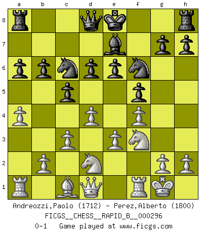 Last move : 0-1 2018 December 9 0:55:54 [Event "FICGS__CHESS__RAPID_B__000296"] [Site "FICGS"] [Date "2018.09.26"] [Round "1"] [White "Andreozzi,Paolo"] [Black "Perez,Alberto"] [Result "0-1"] [WhiteElo "1712"] [BlackElo "1800"] 1.f4 c5 2.Nf3 f5 3.e3 Nf6 4.c3 e6 5.d4 b6 6.Nbd2 Bb7 7.Bd3 d6 8.Bb5+ Bc6 9.a4 a6 10.Bxc6+ Nxc6 11.O-O Be7 0-1 This chess game has been lost on time (started : 2018.09.26 22:51:13) Bird's Opening Kingside Castling by player White (move 11) Player Black won this chess game. Follow this game move after move (download)In Chess, as it is played by masters, chance is practically eliminated. (Emanuel Lasker) Karpov ist ein Museumsstück. (Garry Kasparov) EL Ajedrez es como la vida. (Boris Spassky) Echiquier : carré parfait, comme la Jérusalem nouvelle décrite par l'auteur de l'Apocalypse, huit cases sur huit, exaltation du chiffre 4, symbole du cosmos aux quatre horizons... où le noir et le blanc, l'ombre et la lumière, le mal et le bien s'entremêlent et se conjuguent. (Robert Couffignal, Le Gambit du poète) God is an atheist. (Unknown)