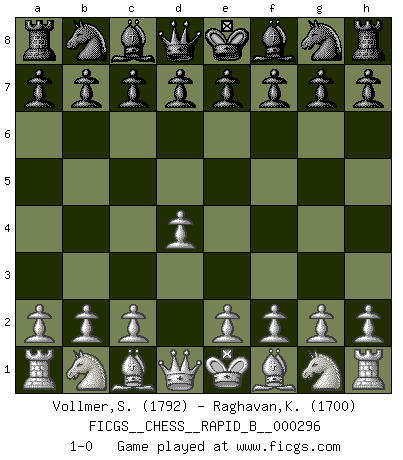 Last move : 1-0 2018 October 27 10:0:33 [Event "FICGS__CHESS__RAPID_B__000296"] [Site "FICGS"] [Date "2018.09.26"] [Round "1"] [White "Vollmer,Steve"] [Black "Raghavan,Krisnamurthy"] [Result "1-0"] [WhiteElo "1792"] [BlackElo "1700"] 1.d4 1-0 This chess game has been lost on time (started : 2018.09.26 22:51:13) Queen's pawn Player White won this chess game. Follow this game move after move (download)The combination player thinks forward; he starts from the given position, and tries the forceful moves in his mind. (Emanuel Lasker) Mit Schach schule ich mein Gefühl für Geometrie, was für Tennis und Schach gleichermaßen wichtig ist. (Boris Becker) Nos gusta pensar. (Gary Kasparov) L'attaque fait le spectacle, la défense gagne les matchs. (Dicton footballistique) History is a gallery of pictures in which there are few originals and many copies. (Alexis de Tocqueville)