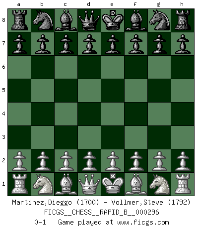 Last move : 0-1 2018 October 27 10:0:33 [Event "FICGS__CHESS__RAPID_B__000296"] [Site "FICGS"] [Date "2018.09.26"] [Round "1"] [White "Martinez,Dieggo"] [Black "Vollmer,Steve"] [Result "0-1"] [WhiteElo "1700"] [BlackElo "1792"] 0-1 This chess game has been lost on time (started : 2018.09.26 22:51:13) Player Black won this chess game. Follow this game move after move (download)It is not a move, even the best move that you must seek, but a realizable plan. (Eugene Znosko-Borovsky) Besser ein falscher Plan, logisch durchgeführt, als gar kein Plan. (Viktor Kortschnoi) Es muy difícil jugar en contra de la teoría de Einstein. - en su primera derrota en contra de Fischer (Mikhail Tal) On est toujours la mazette de quelqu'un d'autre. (Anonyme) Crush them ! Make them suffer ! (General Grievous in Star Wars ep.3)